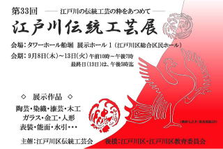 会期:2016.9.8(木)~9.13(火) 10:00~19:00(最終日は17:00まで) 会場:タワーホール船堀 展示ホール1 (江戸川区総合区民ホール) ![]() ■2016年4月1日(金)~3(日) 「伝統工芸を楽しむ三日間」@タワーホール船堀で展示販売いたします。 ・4/2.3に開催される、2016全国さくらシンポジウム in 江戸川 ~さくら さくら 和の心~の期間中、タワーホール船堀の1階で江戸川区内の伝統工芸者による展示販売を行います。 ![]() --------------------------------- 「伝統工芸を楽しむ三日間」 日時:2016.4.1(金)~3(日) 4/1.2は10~18時まで 4/3は9~18時まで 会場:タワーホール船堀1階 ---------------------------------